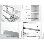 Impeccably designed, our practical Keezi Baby Change Table is the perfect storage solution for your little one. The baby change table makes changing your baby's diapers and clothing a breeze. It also features four spacious drawers and four open shelves to offer ample storage space for all your baby supplies, including diapers, clothes, accessories, toys and more. The top change platform can be easily removed for extra table space, so that you can use the baby change table as a normal storage chest in the children's room or even the master bedroom. Most importantly, it is finely finished with certified non-toxic paint that is completely safe for you and your baby.