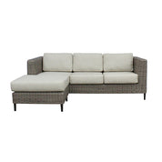 This eye-catching 3-seater with reversible chaise is designed especially for outdoor spaces. The furniture in grey wicker frame and light grey fabric embellishes the outdoor areas. Designed in a Hampton style, the sofa has ample seating space. It is upholstered in high-performance 100% polyester fabric. Sunproof brand fabric upholstered cushions are finished with piped edges. Fabric is weather-proof, water-repellent, stain-resistant, and UV-protected. The seat has full nylon-woven webbing support for extra strength and comfort. The upholstery has a smooth fit due to the intact tailoring on the precision-cut and long-lasting aluminium and full-round synthetic rattan wicker frames. The high-strength wicker supported by a non-rust aluminium frame makes the furniture piece lightweight and resilient. The easy-to-assemble outdoor furniture is durable as well. It comes with a 1-year warranty.
